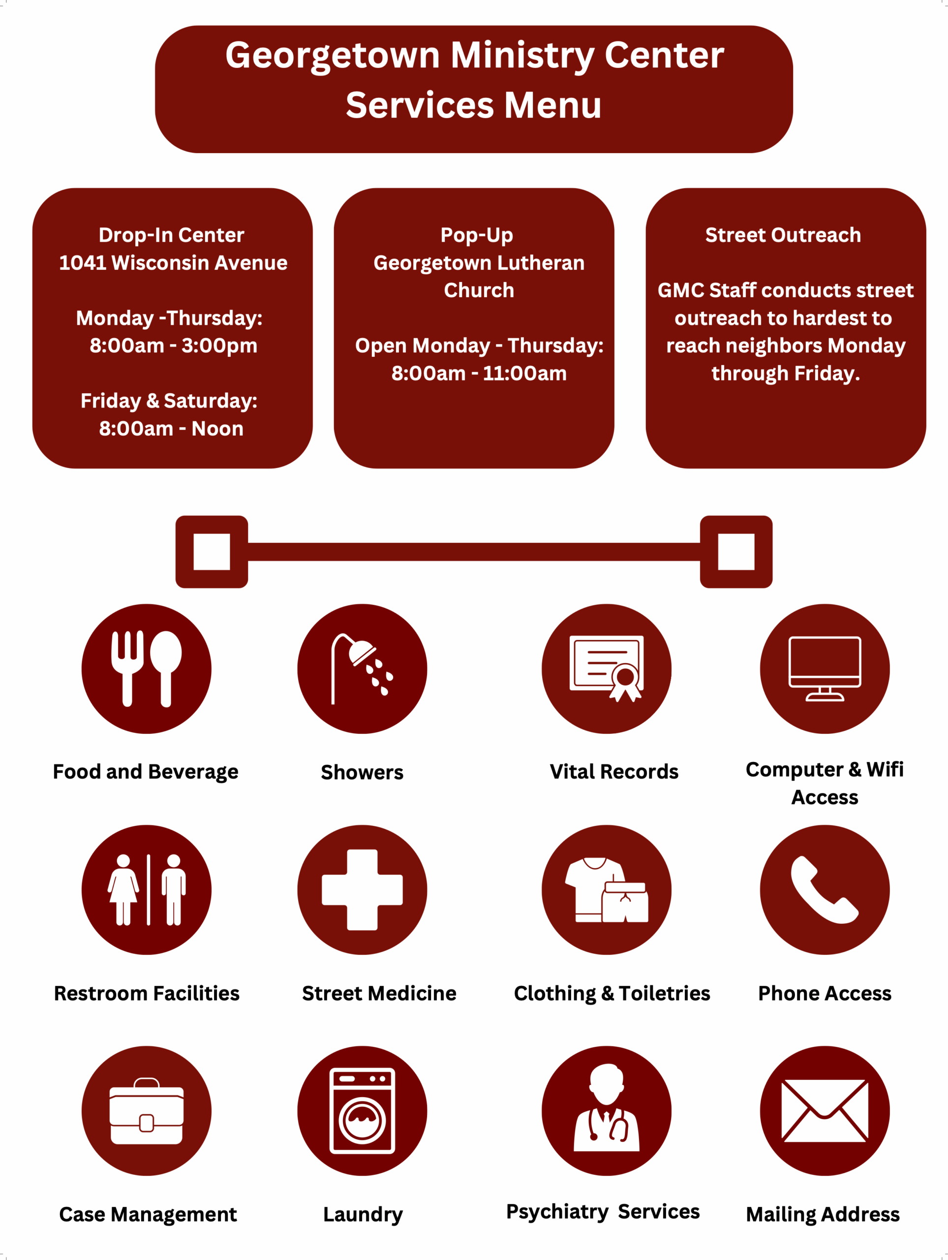 Drop-In Center operates as a low barrier-to-entry club house model and offers a safe haven from the streets 6 days a week serving an average of 73 guests a day. Guests can use computers to check their e-mail and apply for jobs. They also have access to a shower, bathroom, laundry services, service referrals, and light case management. Guests are served lunch, snacks and hot beverages. GMC also offers enrichment activities including art therapy, meditation, poetry, life skills, and harm reduction workshops. Starting in June 2021, GMC launched a second Pop-Up location at Georgetown Lutheran Church, that is open 4- days a week. This additional space augments many of the services provided at the Drop-in Center like additional laundry and bathroom facilities. Guests have additional room to spread out and watch movies or engage in other programming offered.
